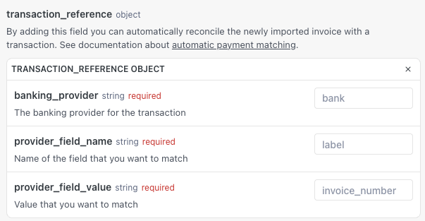 If you have a payment to link with the invoice you are creating / importing, it is possible to automatically reconciliate the invoice with this transaction. The only condition is to be able to give us a unique id so that we know which transaction to match with the invoice. To do so, you need to use the transaction_reference object.